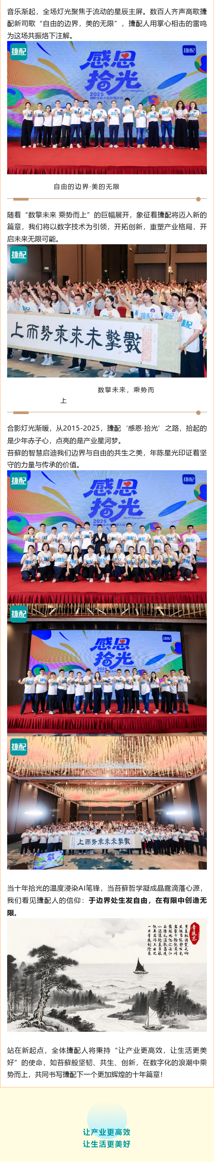 站在新起点,全体捷配人将秉持“让产业更高效,让生活更美好”的使命,如苔藓般坚韧、共生、创新,在数字化的浪潮中乘势而上,共同书写捷配下一个更加辉煌的十年篇章!